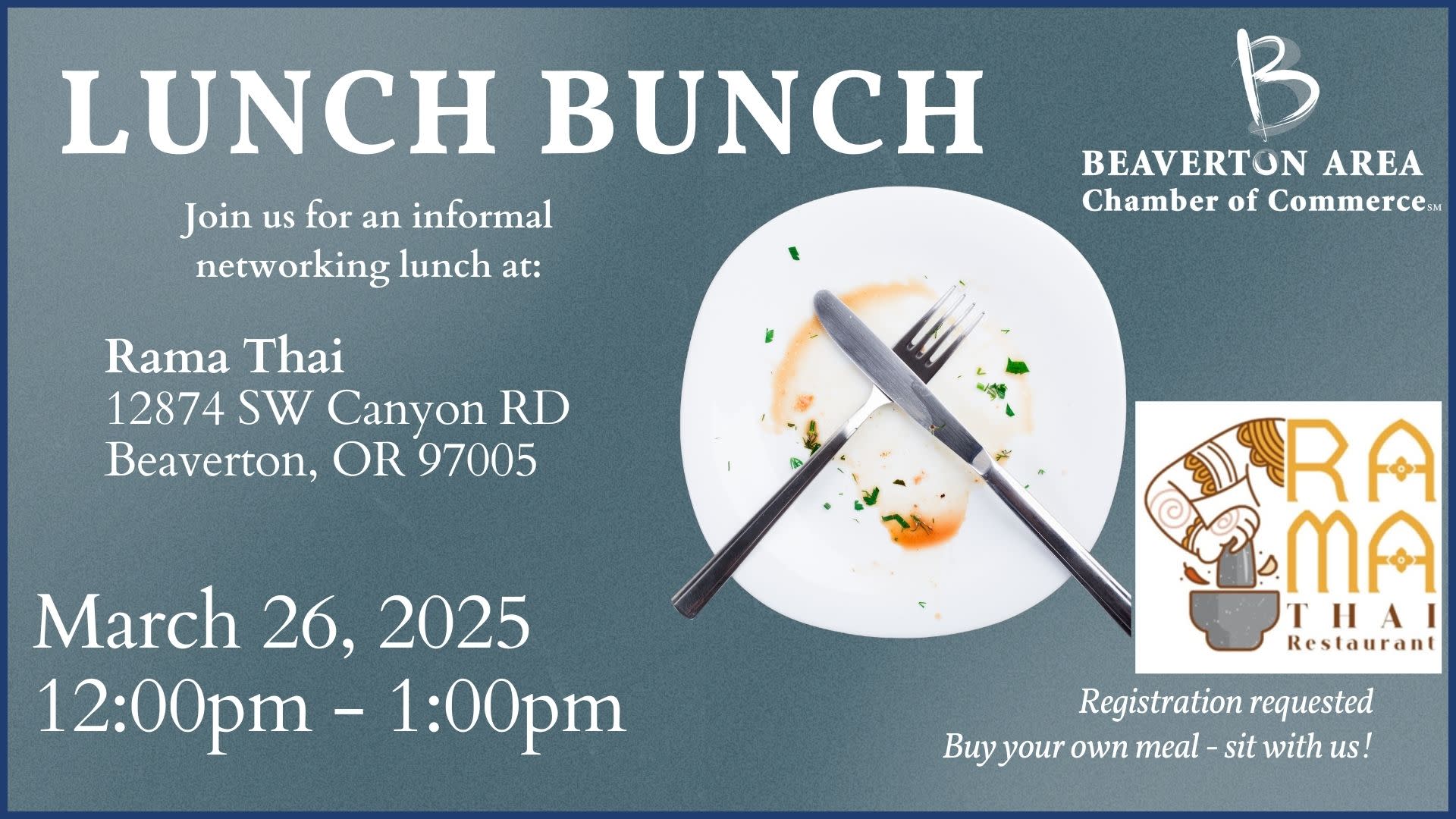 Remember, registration is requested so we can tell the restaurant how many to expect! Come hungry, leave with new connections and a satisfied stomach. We can't wait to see you there!