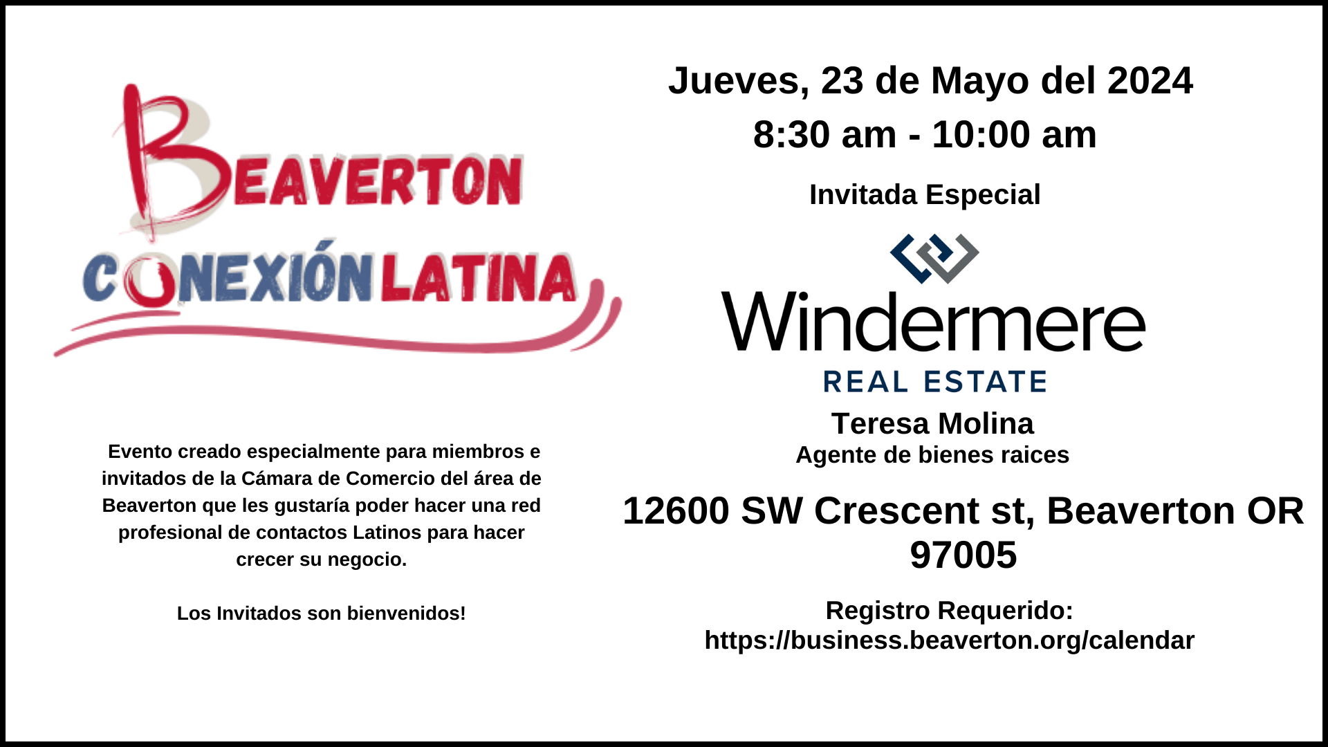 Beaverton Conexión Latina es un evento creado especialmente para miembros e invitados de la Cámara de Comercio del área de Beaverton que les gustaría poder hacer una red profesional de contactos Latinos para hacer crecer su negocio. Adicional, podrá aprender de otros dueños consejos para mejorar su negocio, así que, si usted tiene alguna inquietud profesional, este es el lugar correcto y juntos lo resolveremos. Los invitados son siempre bienvenidos - hazle un favor a un amigo - ¡invítalo a Beaverton Conexión Latina! Registro solicitado. Este evento se estará realizando el último jueves del mes, iniciando a las 8:30 am en la Cámara de Comercio del área de Beaverton, por favor de llegar unos minutos antes para que pueda disfrutar de nuestro cafecito.