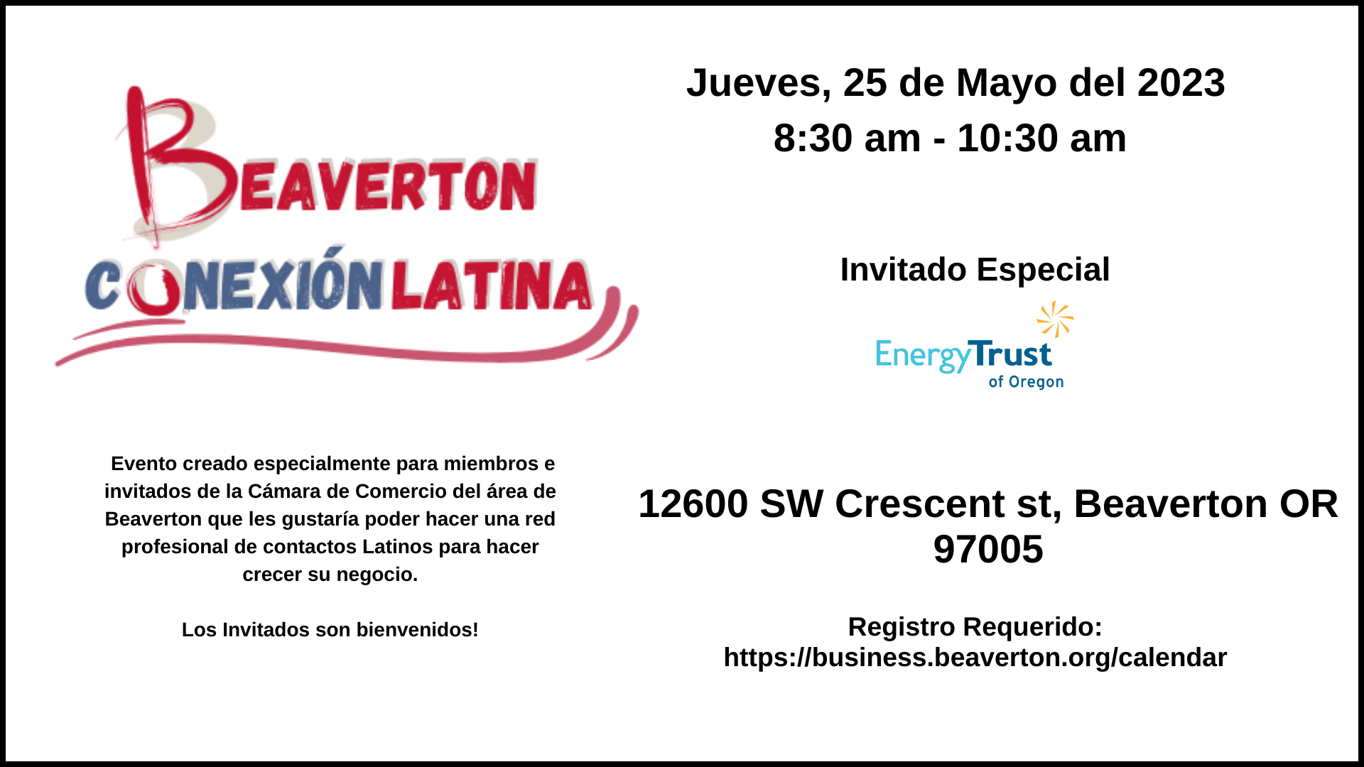Beaverton Conexion Latina es un evento creado especialmente para miembros de la Camara de Comercio del area de Beaverton que les gustaría poder hacer una red profesional de contactos Latinos para hacer crecer su negocio. Adicional, podrá aprender de otros duenos consejos para mejorar su negocio, así que, si usted tiene alguna inquietud profesional, este es el lugar correcto y juntos lo resolveremos.