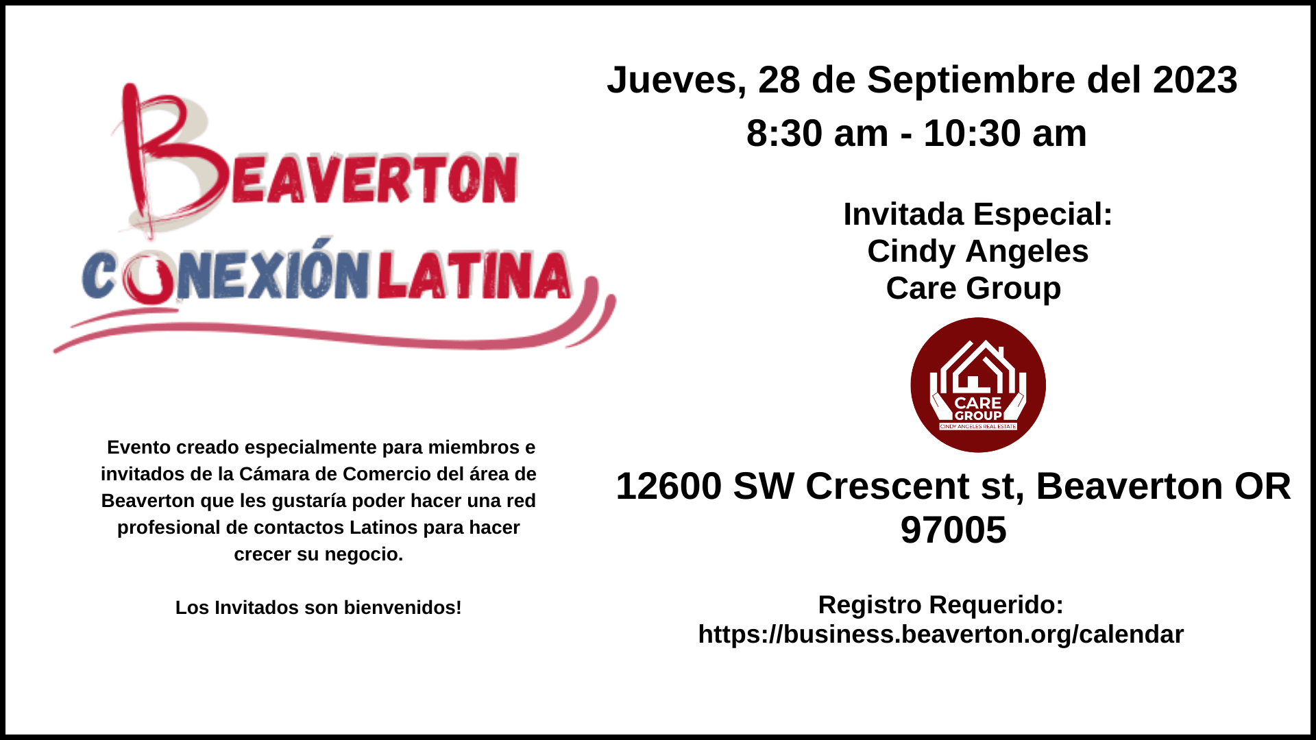 Beaverton Conexión Latina es un evento creado especialmente para miembros e invitados de la Cámara de Comercio del área de Beaverton que les gustaría poder hacer una red profesional de contactos Latinos para hacer crecer su negocio. Adicional, podrá aprender de otros dueños consejos para mejorar su negocio, así que, si usted tiene alguna inquietud profesional, este es el lugar correcto y juntos lo resolveremos. Los invitados son siempre bienvenidos - hazle un favor a un amigo - ¡invítalo a Beaverton Conexión Latina! Registro solicitado. Este evento se estará realizando el último jueves del mes, iniciando a las 8:30 am en la Cámara de Comercio del área de Beaverton, por favor de llegar unos minutos antes para que pueda disfrutar de nuestro cafecito.Images
