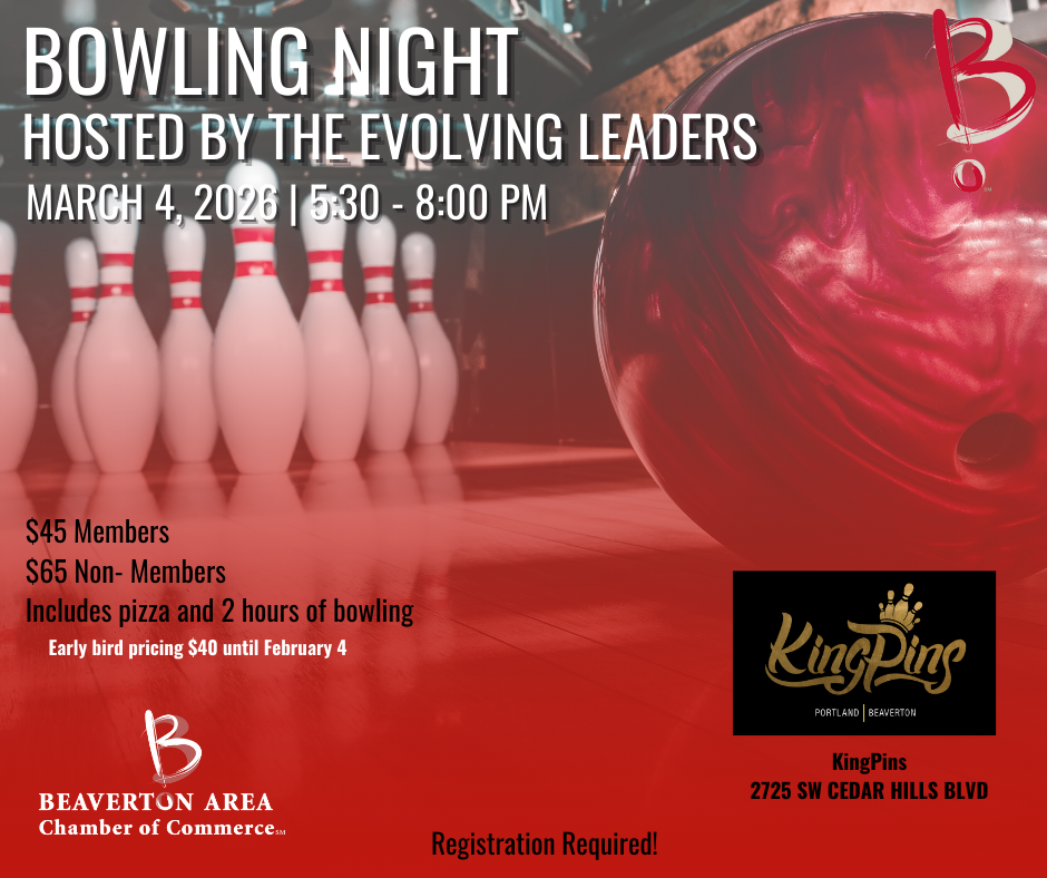 Join Evolving Leaders for a fun and casual Bowling Night at KingPins Beaverton. This is a great opportunity to connect with fellow professionals in a relaxed setting while enjoying a little friendly competition. 🎳