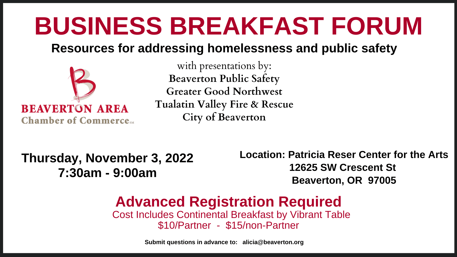 How is this affecting our local west side community? Will we see more unhoused neighbors at our business’s front doors? Is this a larger public safety conversation? How are the Metro and city funds addressing the issue in Beaverton? How do we come together to model community-based, supportive – and integrated – solutions?