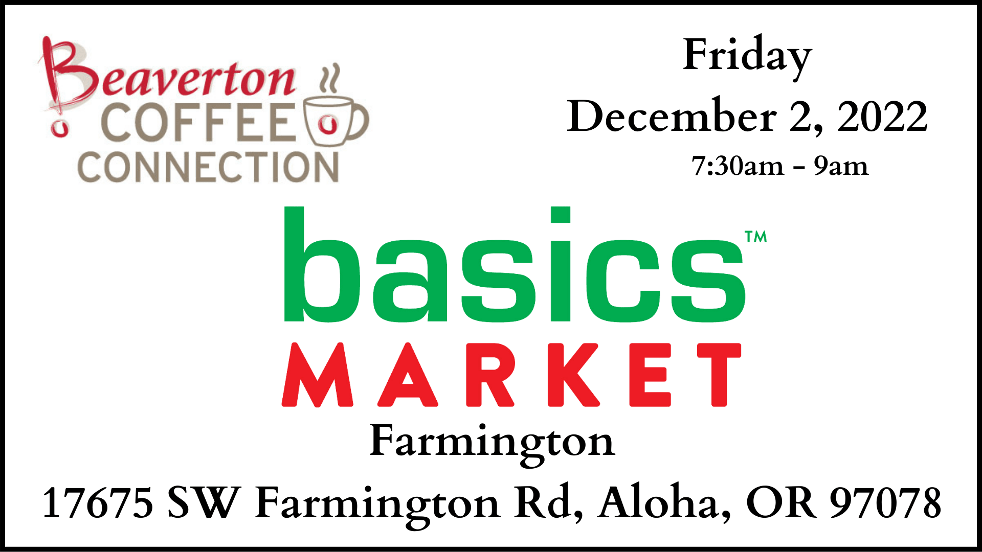 On location at: Basics Market Farmington, 17675 SW Farmington Rd, Aloha, OR 97078