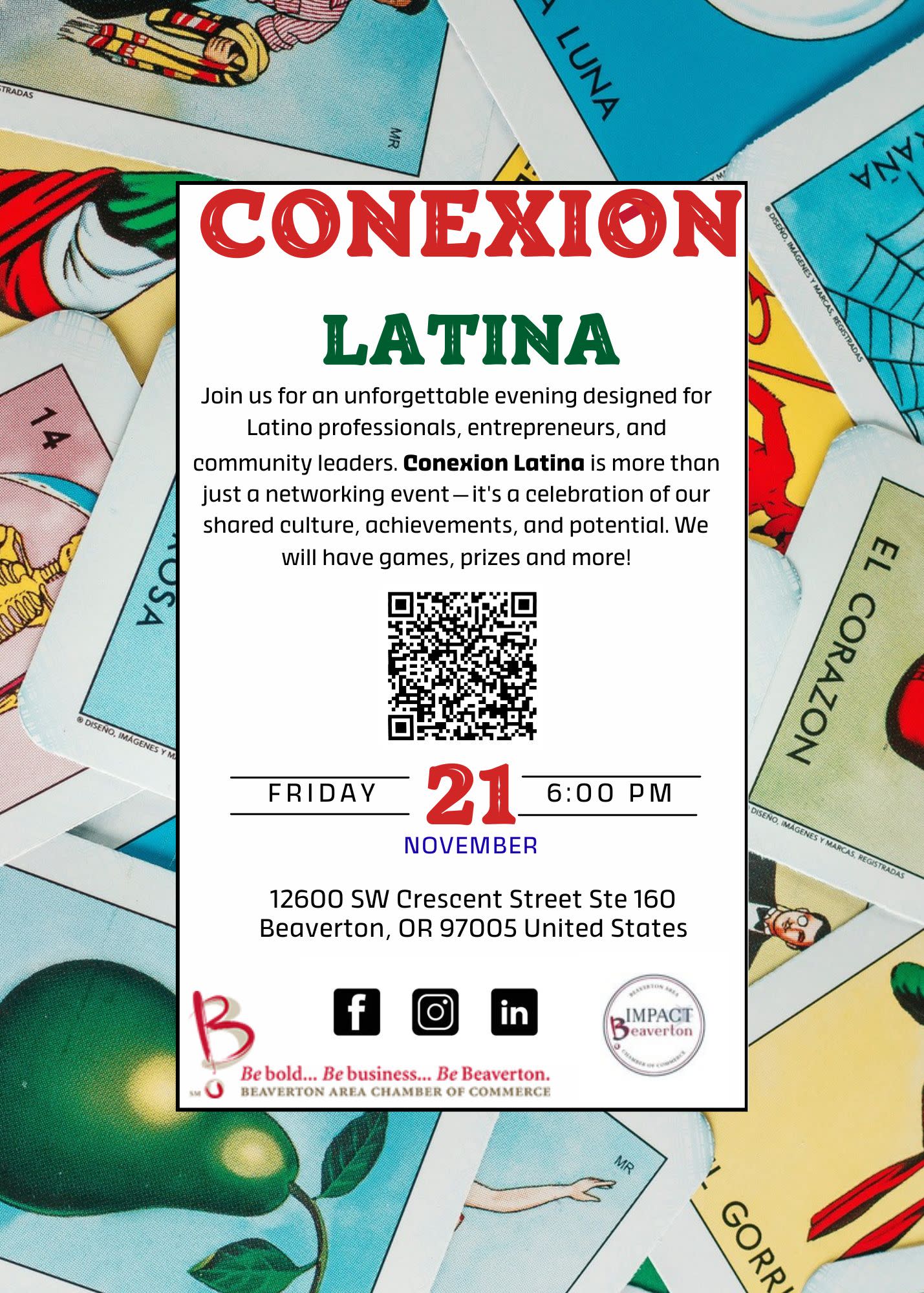 Hosted by the Beaverton Area Chamber of Commerce – Conexión Latina, this gathering provides a welcoming space to share ideas, exchange resources, and strengthen relationships within our diverse business community. Whether you’re looking to collaborate, grow your network, you’re invited to join us!