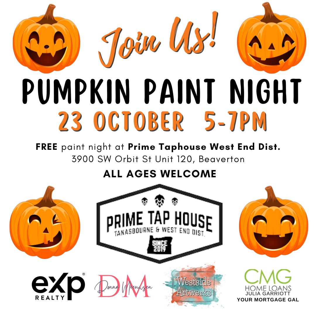 Come join the fun! This is going to be a Spooktacular event! 🎃 👻 Join us for a fun free Pumpkin Paint Night at Prime Tap House: West End Dist. We'll provide the supplies, just come and have fun! Grab a bite, enjoy $1 off pints for those participating in the event and leave with some Halloween spirit! Westside Artwerks will be there supplying the paint supplies and showcasing some of their jewelry! Thank you to the host Prime Tap House. Also thank you to Monika Piazza with Westside Artwerks, Julia Garriott, Your Mortgage Gal with CMG Mortgage and Donna Meeuwsen with eXp Realty for teaming up for this fun community event! October 23rd!! Come paint a pumpkin, have some dinner and enjoy $1 off a pint for those participating in the event! It's from 5-7! Come early for the fun before the pumpkins run out! Message me with questions! 503.583.3200