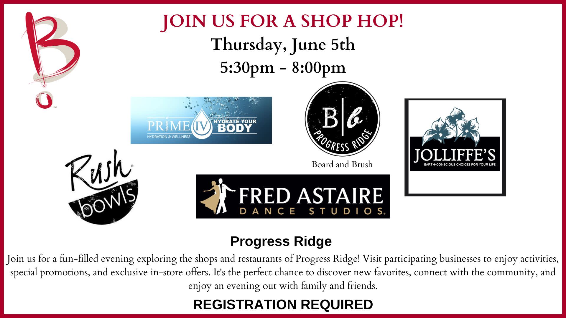 Join us for a free, fun-filled evening exploring the shops and restaurants of Progress Ridge! Visit participating businesses to enjoy activities, special promotions, and exclusive in-store offers. It's the perfect chance to discover new favorites, connect with the community, and enjoy an evening out with family and friends.