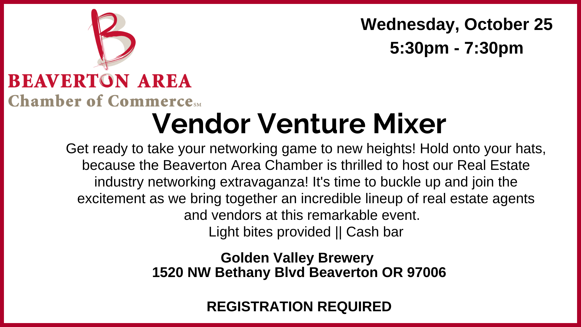 Get ready to take your networking game to new heights! Hold onto your hats, because the Beaverton Area Chamber is thrilled to host our Real Estate industry networking extravaganza! It's time to buckle up and join the excitement as we bring together an incredible lineup of real estate agents and vendors at this remarkable event.