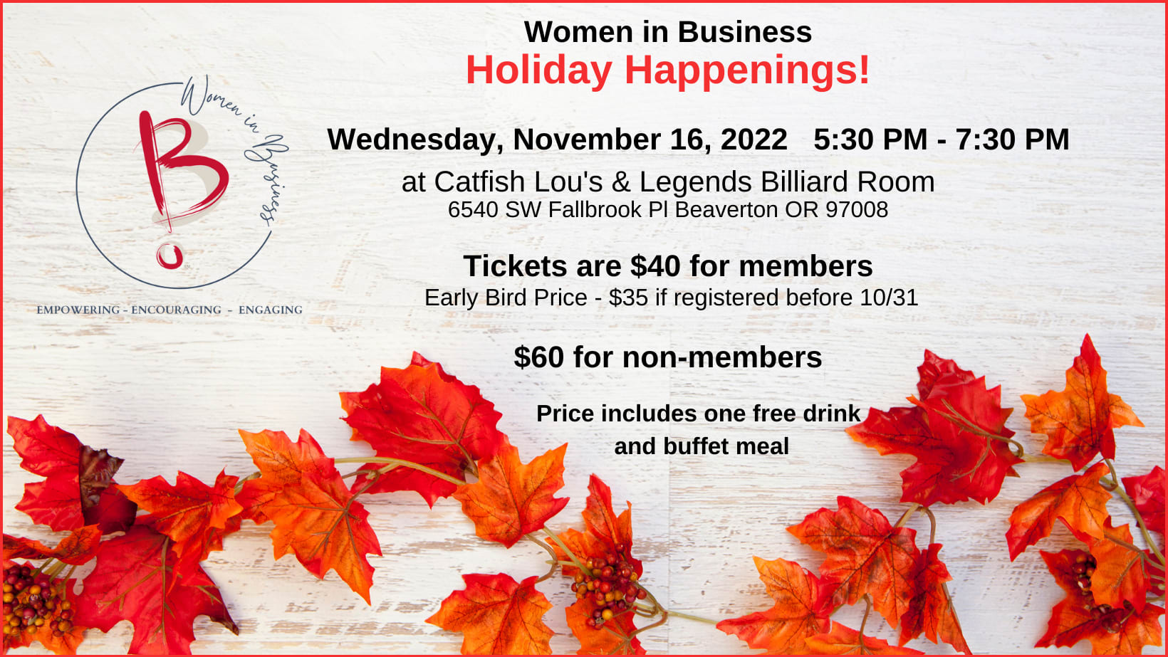 Meet other businesswomen in the Beaverton Area while enjoying some great food! What could be better?