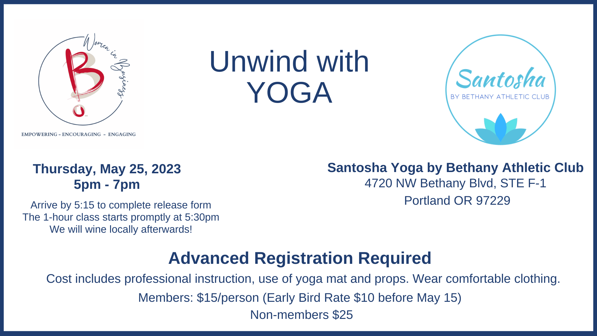 Are you ready to release some tension and unwind with some wine? Join us at Santosha Yoga by Bethany Athletic Club at 5:15 pm sharp to complete a quick release form before we dive into an hour of invigorating yoga practice at 5:30 pm. Our professional instructor will guide you through a series of poses, and we've got you covered with yoga mats and props to help you make the most of your experience. So wear your comfiest clothes and get ready to stretch, breathe, and feel the energy flow!