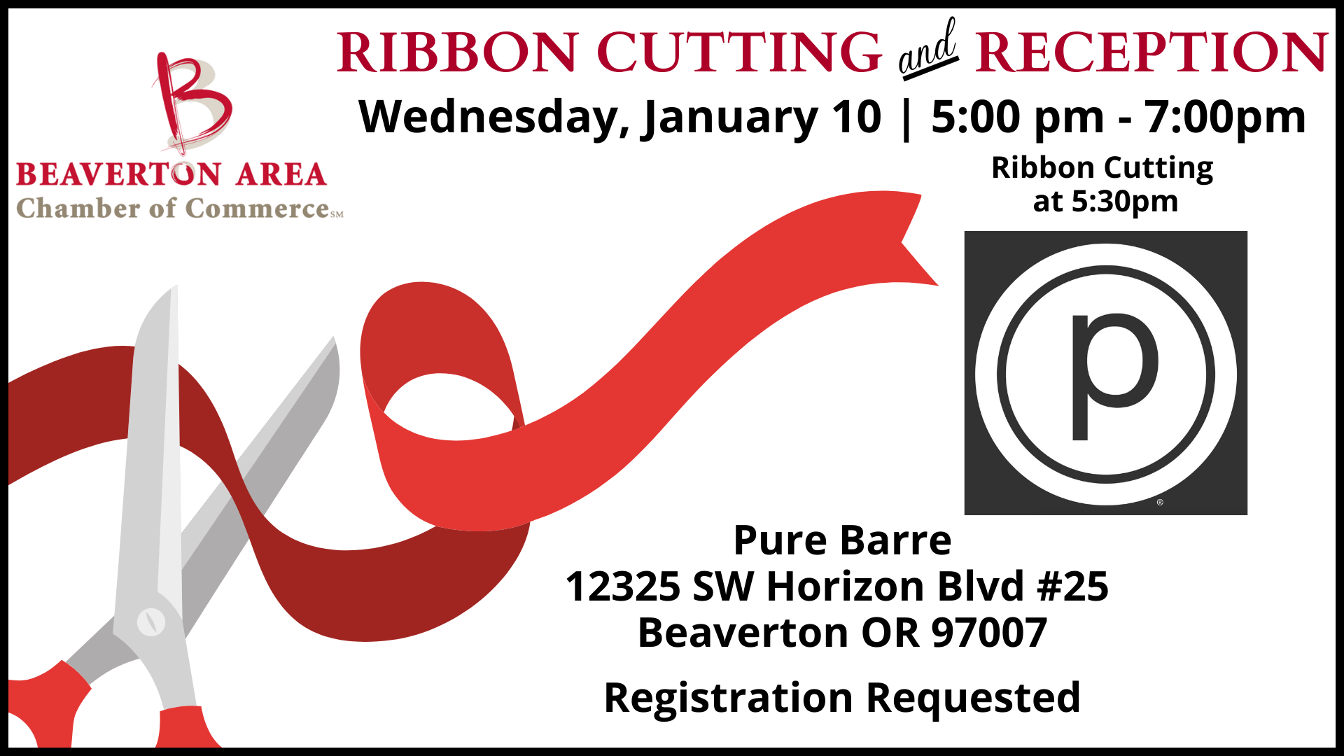DESCRIPTION:Join us as we welcome\nPure Barre to Beaverton!\n\nGather at 5 pm\; Ribbon Cutting at 5:30 pmJoin us after the Ribbon Cutting for a small reception.\n\nRegistration Requested